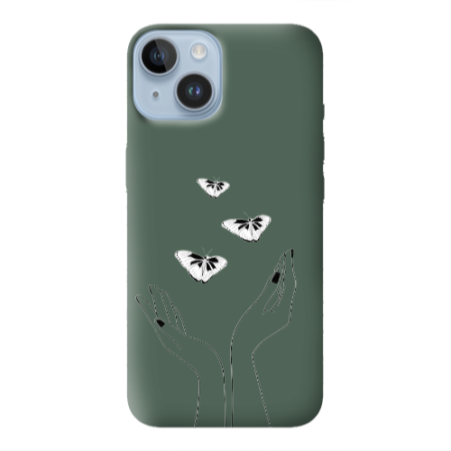 Apple iPhone 14 Avucumdaki Kelebek Koyu Yeşil Renkli Silikon Telefon Kılıfı
