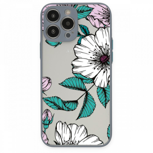 Apple iPhone 13 Pro Beyaz Mor Çiçek Gri Hux Telefon Kılıfı