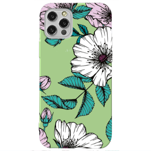 Apple iPhone 12 Pro Beyaz Mor Çiçek Açık Yeşil Renkli Silikon Telefon Kılıfı