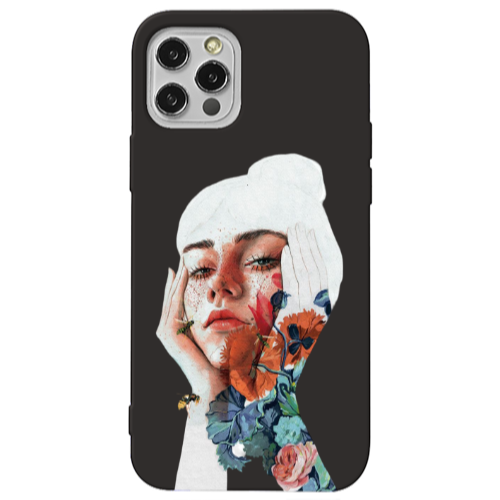 Apple iPhone 12 Pro Çiçek Kadın Siyah Renkli Silikon Telefon Kılıfı