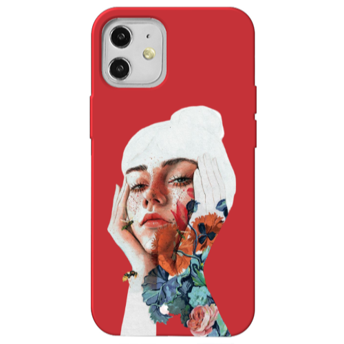 Apple iPhone 12 Mini Çiçek Kadın Kırmızı Renkli Silikon Telefon Kılıfı