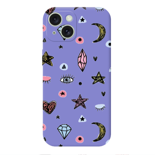 Apple iPhone 15 Elmas Yıldız Ay Lila Renkli Silikon Telefon Kılıfı