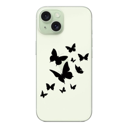 Apple iPhone 15 Siyah Kelebek Koyu Yeşil Renkli Silikon Telefon Kılıfı