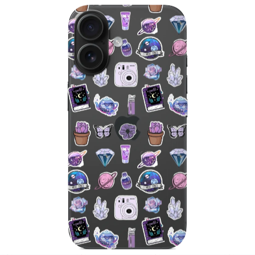 Apple iPhone 16 Plus Mor Nesneler Sarı Renkli Silikon Telefon Kılıfı