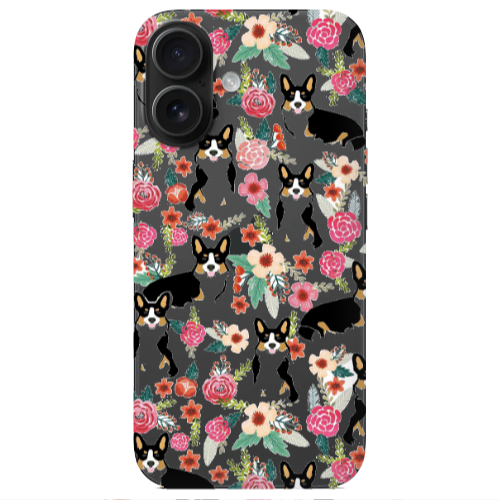 Apple iPhone 16 Köpek Çiçekler Siyah Renkli Silikon Telefon Kılıfı