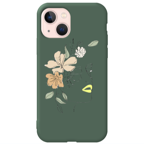 Apple iPhone 13 Mini Kadın Silüet Çiçek Koyu Yeşil Renkli Silikon Telefon Kılıfı