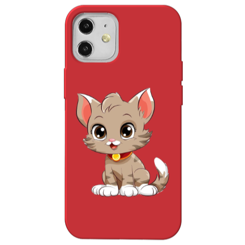 Apple iPhone 12 Kahve Kedi Kırmızı Renkli Silikon Telefon Kılıfı