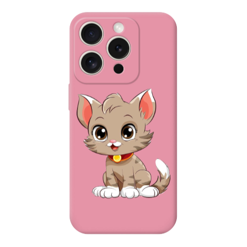 Apple iPhone 15 Pro Kahve Kedi Pembe Renkli Silikon Telefon Kılıfı