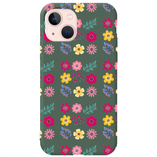 Apple iPhone 13 Karışık Çiçek2 Koyu Yeşil Renkli Silikon Telefon Kılıfı