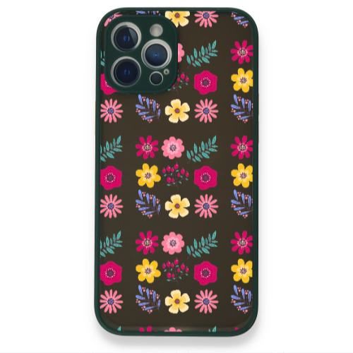 Apple iPhone 12 Pro Max Karışık Çiçek2 Koyu Yeşil Hux Telefon Kılıfı