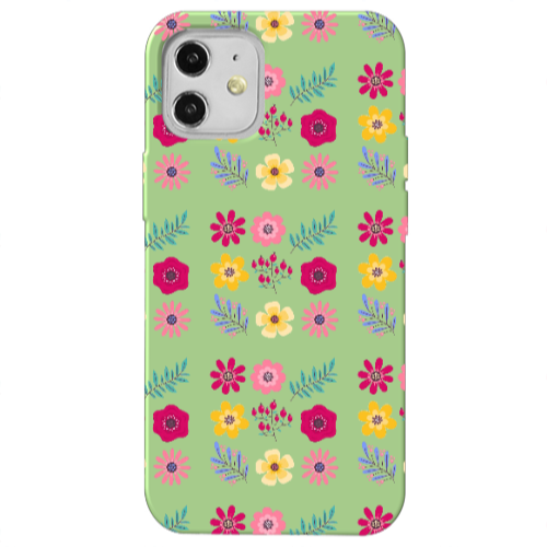 Apple iPhone 12 Mini Karışık Çiçek2 Açık Yeşil Renkli Silikon Telefon Kılıfı