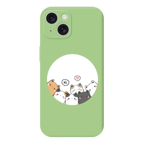 Apple iPhone 15 Kediler Açık Yeşil Renkli Silikon Telefon Kılıfı