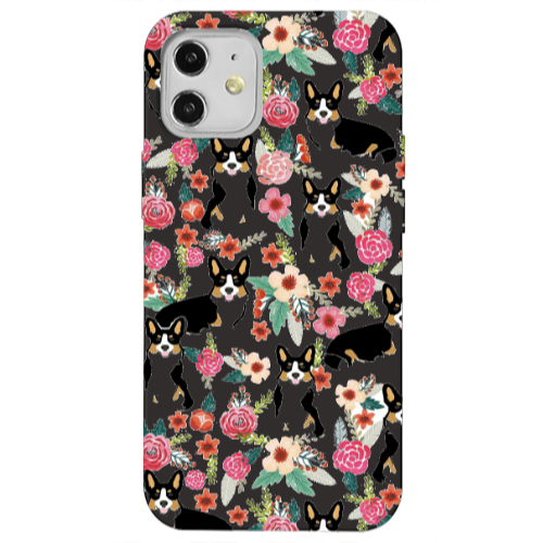 Apple iPhone 12 Mini Köpek Çiçekler Siyah Renkli Silikon Telefon Kılıfı