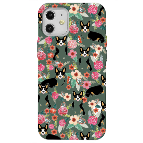 Apple iPhone 12 Mini Köpek Çiçekler Koyu Yeşil Renkli Silikon Telefon Kılıfı