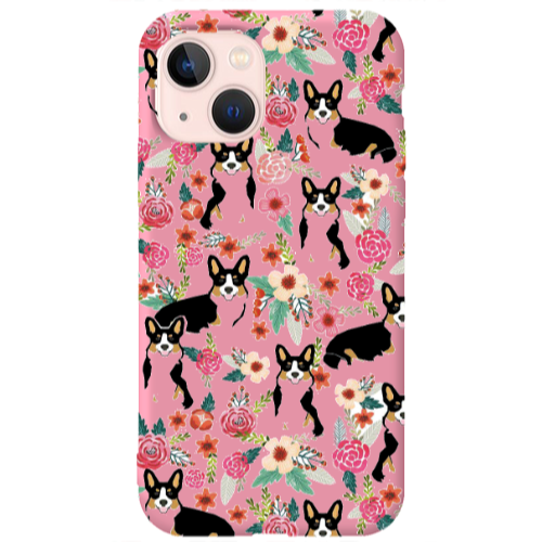 Apple iPhone 13 Mini Köpek Çiçekler Pembe Renkli Silikon Telefon Kılıfı