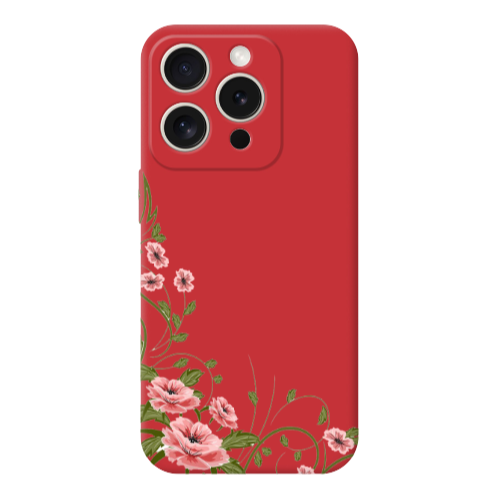 Apple iPhone 15 Pro Köşe Çiçeği Kırmızı Renkli Silikon Telefon Kılıfı