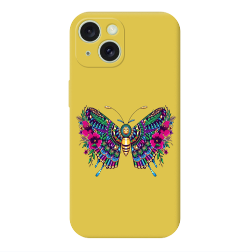 Apple iPhone 15 Mandala Kelebek Sarı Renkli Silikon Telefon Kılıfı