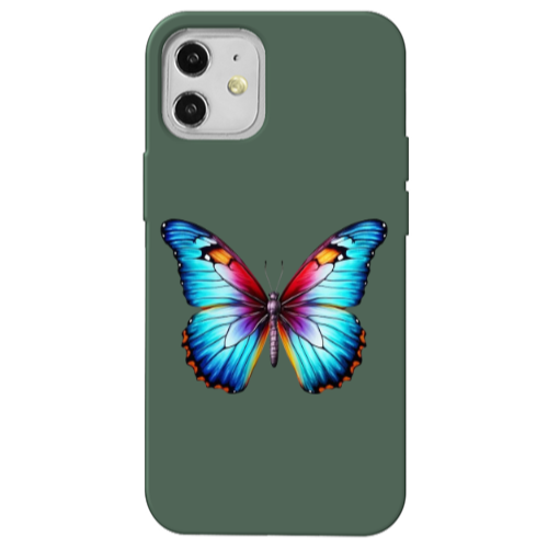 Apple iPhone 12 Mini Mavi Kelebek Koyu Yeşil Renkli Silikon Telefon Kılıfı