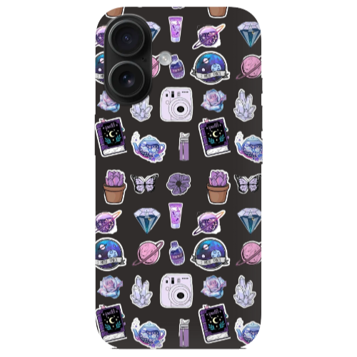 Apple iPhone 16 Mor Nesneler Siyah Renkli Silikon Telefon Kılıfı