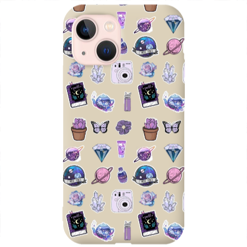 Apple iPhone 13 Mor Nesneler Krem Renkli Silikon Telefon Kılıfı