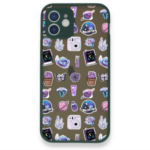 Apple iPhone 12 Mini Mor Nesneler Koyu Yeşil Hux Telefon Kılıfı