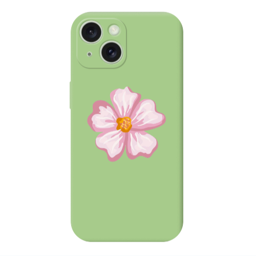 Apple iPhone 15 Pembe Çiçek3 Açık Yeşil Renkli Silikon Telefon Kılıfı