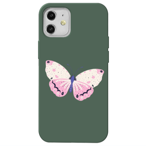 Apple iPhone 12 Mini Pembe Kelebek Koyu Yeşil Renkli Silikon Telefon Kılıfı