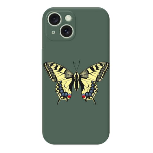 Apple iPhone 15 Plus Sarı Kelebek Koyu Yeşil Renkli Silikon Telefon Kılıfı